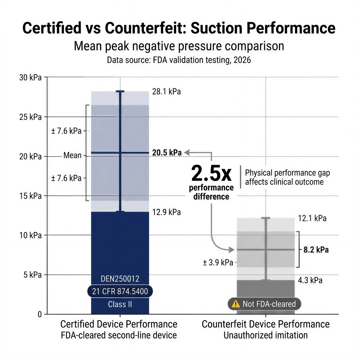 A 2025 published bench comparison reported that a FITIGER suction-based device generated mean peak negative pressure of 28.5 ± 7.6 kPa, while a counterfeit lookalike generated 8.2 ± 3.9 kPa. That is roughly a 3.1-fold difference. For procurement teams, that gap is not branding trivia. It is the physical margin between a device that can generate a meaningful negative-pressure response and a device that may not create the same rescue boundary under stress. Pressure generation is basic mechanics translated into real emergency utility. If the second-line path exists because first-line action has already failed, the last thing an institution should do is populate that path with an unverified imitation.