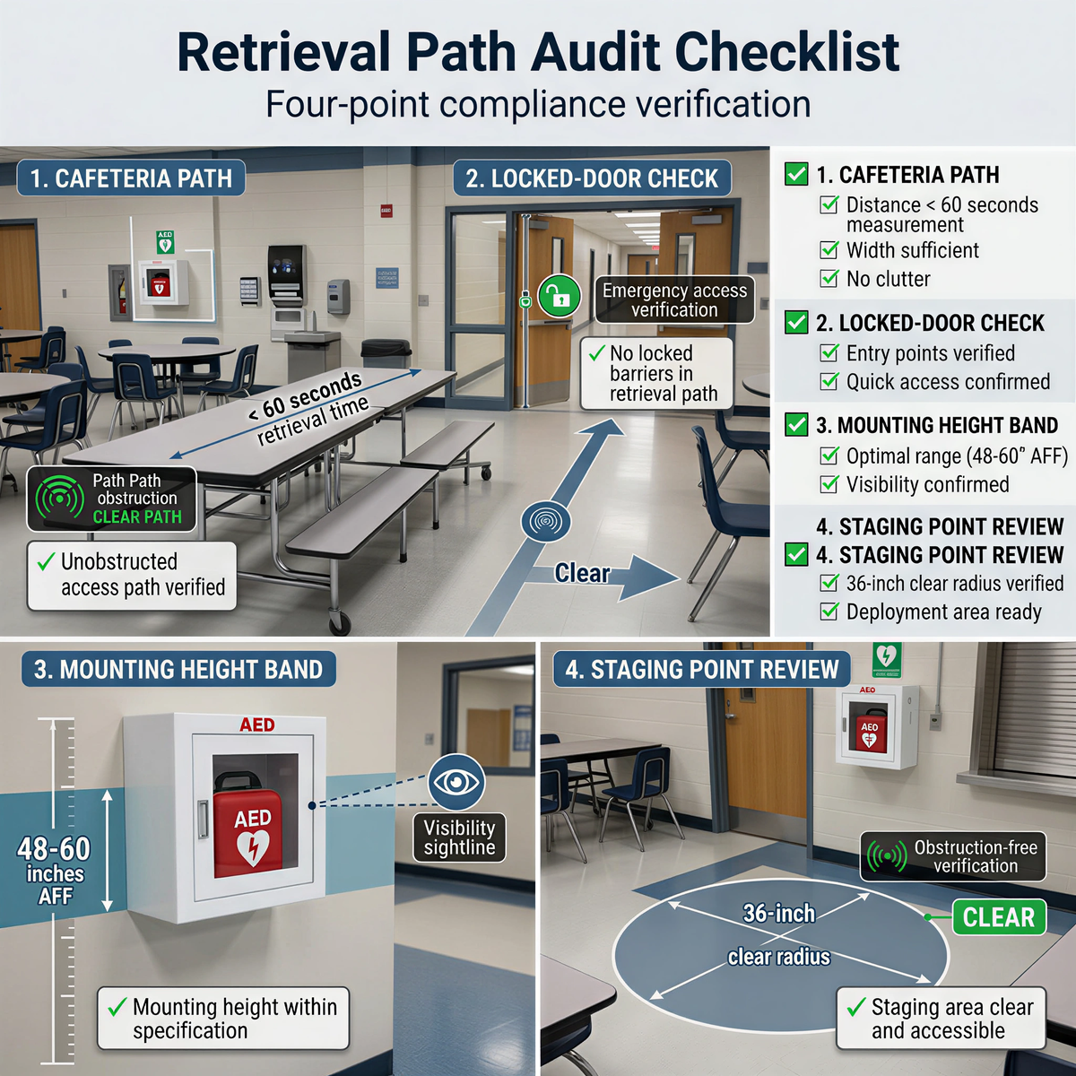 Schools and child care operators should run a simple retrieval-path audit in the real environment. Start at the farthest likely incident point in the cafeteria, toddler room, or snack area. Walk the shortest path to the nearest emergency staging point. Note every locked door, congested turn, blocked cabinet, or visibility problem. Check whether the device can be reached without abandoning the student group or creating a second point of confusion. In parallel, check mounting height and reach. As an accessibility-oriented baseline, many institutions use a target band roughly 34 to 48 inches above finished floor for frequently needed emergency equipment so shorter staff and wheelchair users are not excluded by placement itself.