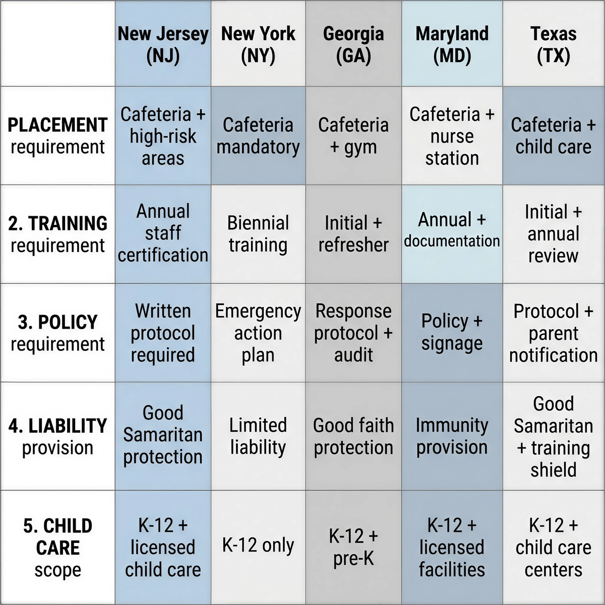 One of the easiest mistakes in 2026 is to talk about 'state mandates' as if they all say the same thing. They do not. New Jersey is more explicit about school placement and signage. New York leans harder into policy, training, and liability structure. Georgia pushes the issue into child care and links it to CPR timing for direct-care staff. Maryland sharpens the storage question around the places where people primarily eat. Texas contributes a disability-accommodation model that changes how districts should think about students who may need individualized emergency planning. The trend is shared. The operating details are not.