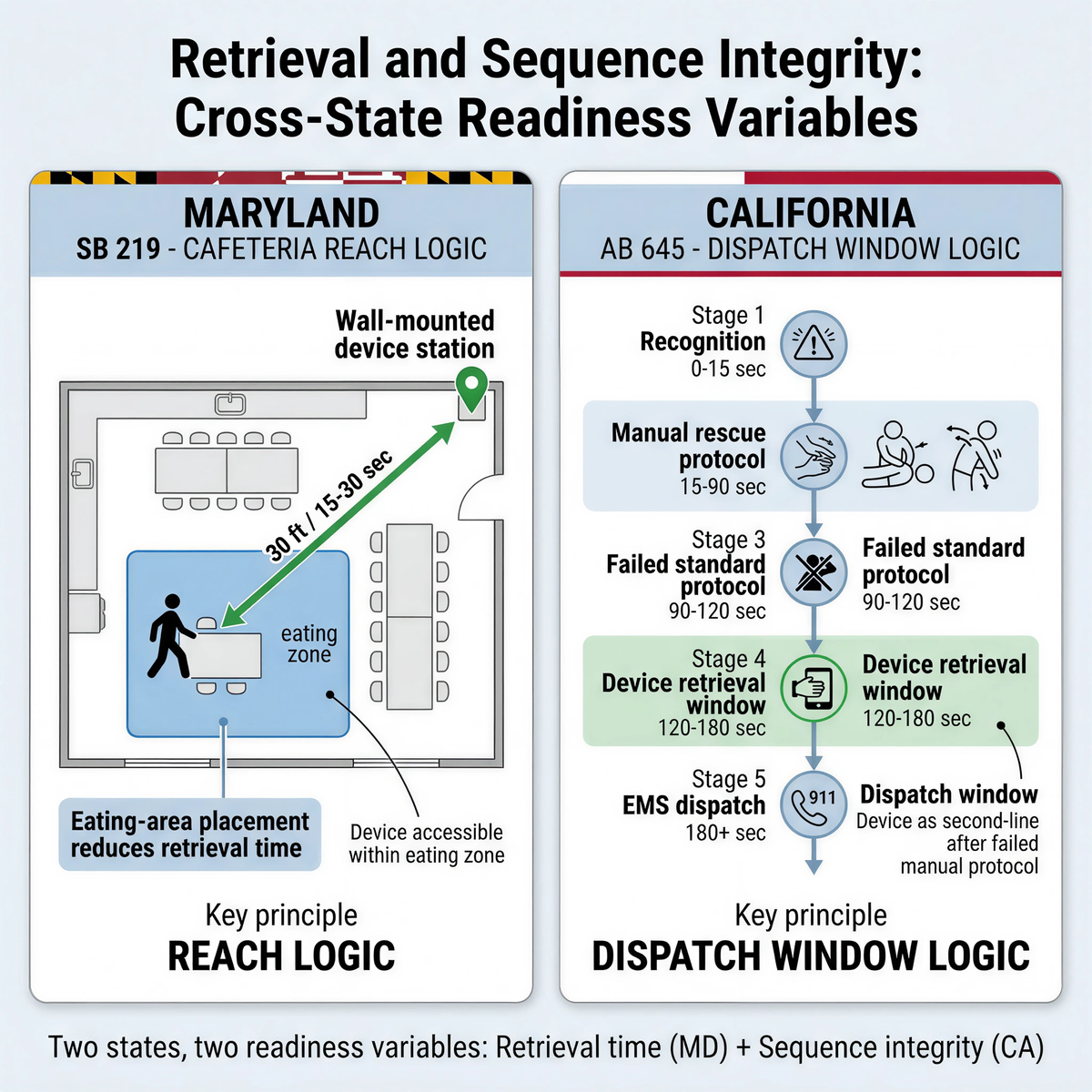 Fitiger also sees Maryland's retrieval logic as part of a broader cross-state pattern. California's AB 645 moves airway emergencies deeper into the dispatch window by requiring prearrival medical instructions for choking and other emergencies by January 1, 2027, subject to local EMS medical director approval. The common engineering issue is not geography. It is sequence integrity. Whether the responder is moving across a cafeteria or following dispatcher instructions over the phone, the same question remains: can the system shorten the path from recognition to usable second-line backup without displacing first-line rescue.