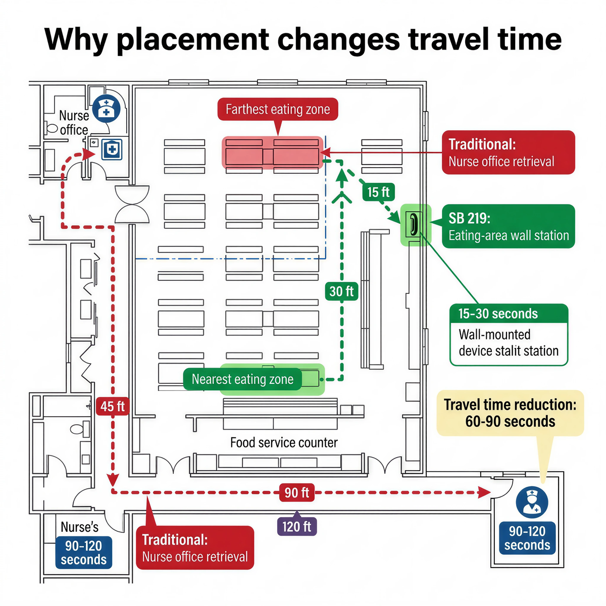 For Fitiger, that placement language matters because retrieval delay is part of the emergency. A second-line tool staged too far from a cafeteria or other primary eating area is not functioning as a practical backup path. It is functioning as a time penalty. Maryland's school debate is therefore moving toward a more operational question: not simply whether a device is present somewhere on campus, but whether trained staff can reach it without losing the room after standard first-line measures have already been attempted and have not resolved the obstruction.