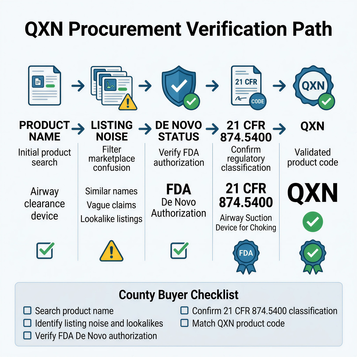 The FDA's March 2026 classification codifies the sequence. Under 21 CFR 874.5400, product code QXN, a 'suction anti-choking device as a second-line treatment' is intended for use only after unsuccessful use of a basic life support choking protocol in victims experiencing complete airway obstruction. For school systems and county procurement teams, that means device review cannot stop at a product name or a marketplace listing. The buyer has to verify whether the device sits inside the authorized Class II framework for this category.