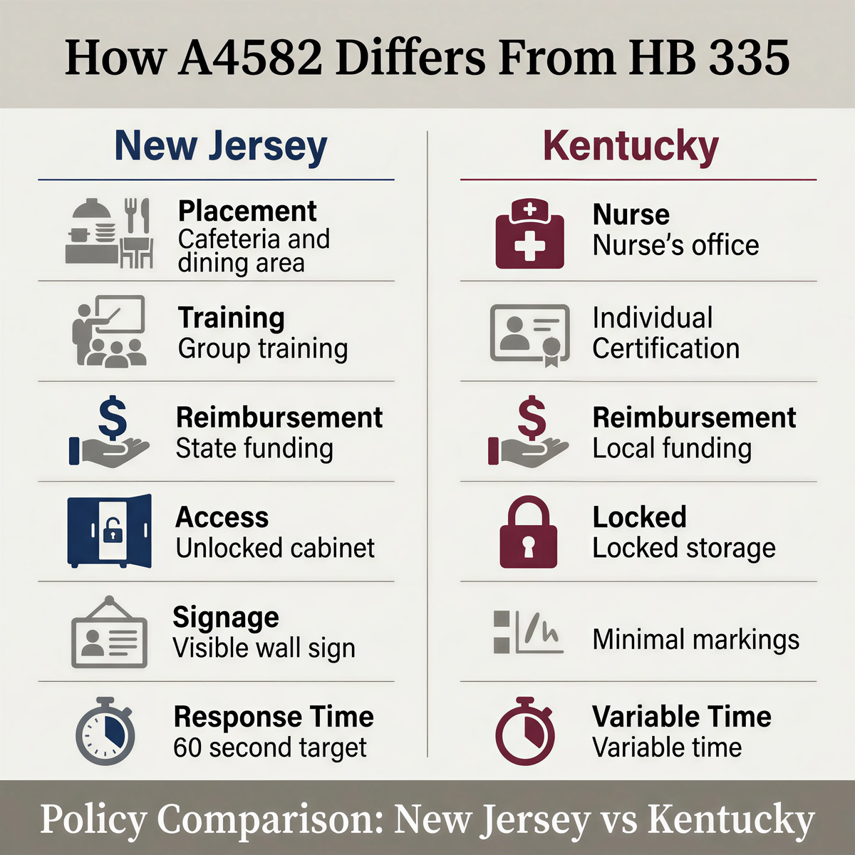 For newsroom coverage, the key distinction is simple: Kentucky’s bill mainly addresses training and legal protection when a school has already chosen to obtain a device. A4582 goes further by proposing statewide placement, access, training, and reimbursement requirements in one package.